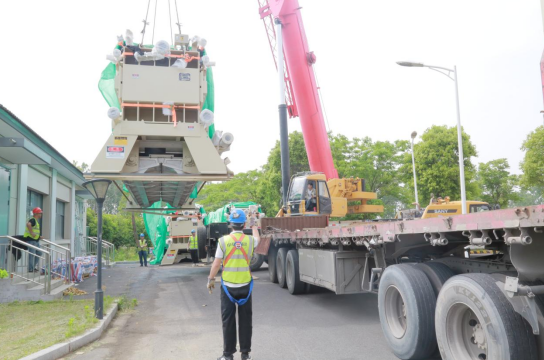 面對(duì)工期緊張、作業(yè)空間受限等挑戰(zhàn),濱海供水公司成立專班工作組,聯(lián)合設(shè)備供應(yīng)商,通過提升專家論證層級(jí)、邀請(qǐng)區(qū)級(jí)大型建筑行業(yè)專家優(yōu)化吊裝方案、并開展多輪現(xiàn)場(chǎng)踏勘,最終確定創(chuàng)新采用400噸級(jí)重型吊機(jī),吊裝高度達(dá)21米。作業(yè)現(xiàn)場(chǎng),施工團(tuán)隊(duì)精準(zhǔn)測(cè)算設(shè)備進(jìn)場(chǎng)路徑及吊臂旋轉(zhuǎn)半徑,實(shí)現(xiàn)單臺(tái)設(shè)備2小時(shí)快速定位,安全高效完成吊裝作業(yè)。