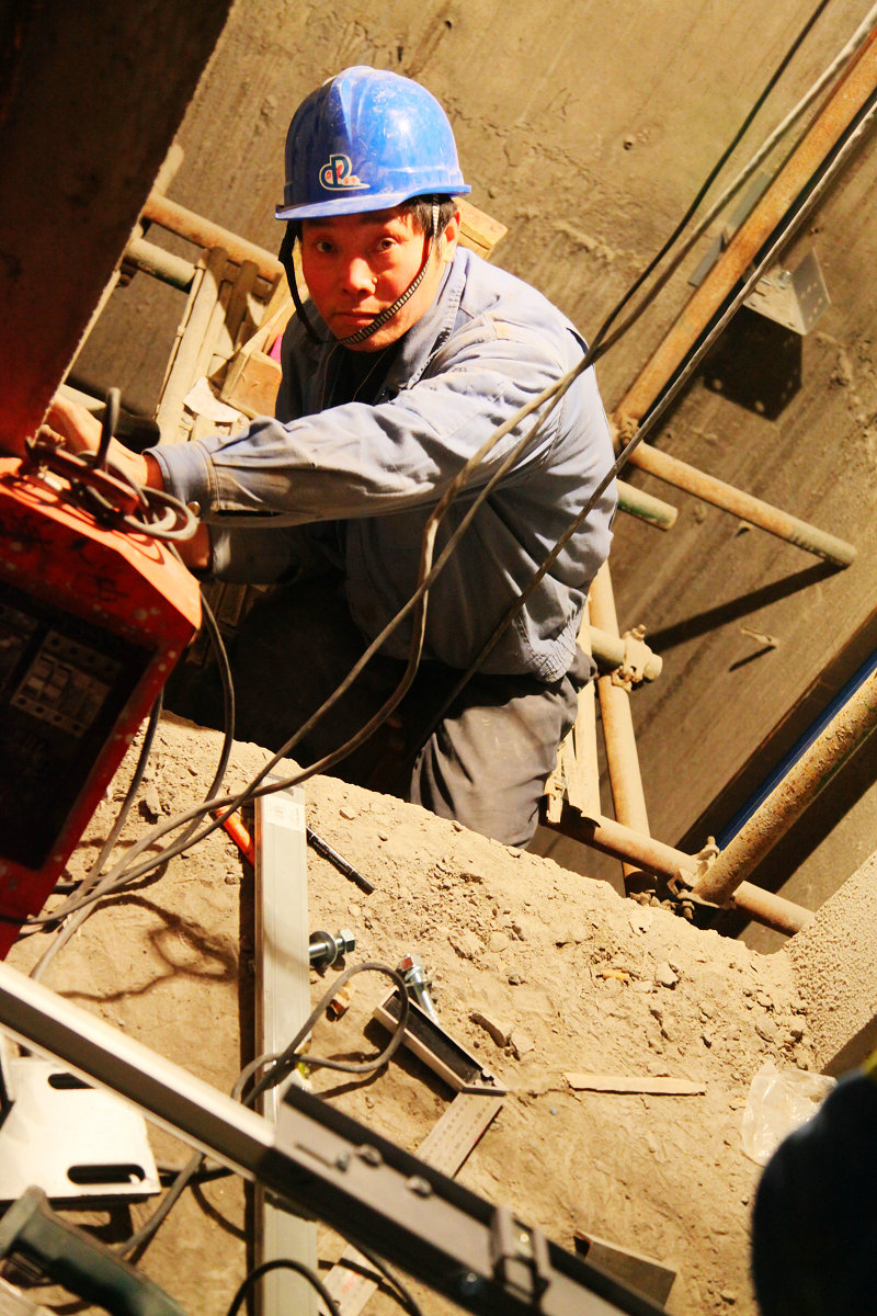 圖為施工人員正在安裝電梯軌道