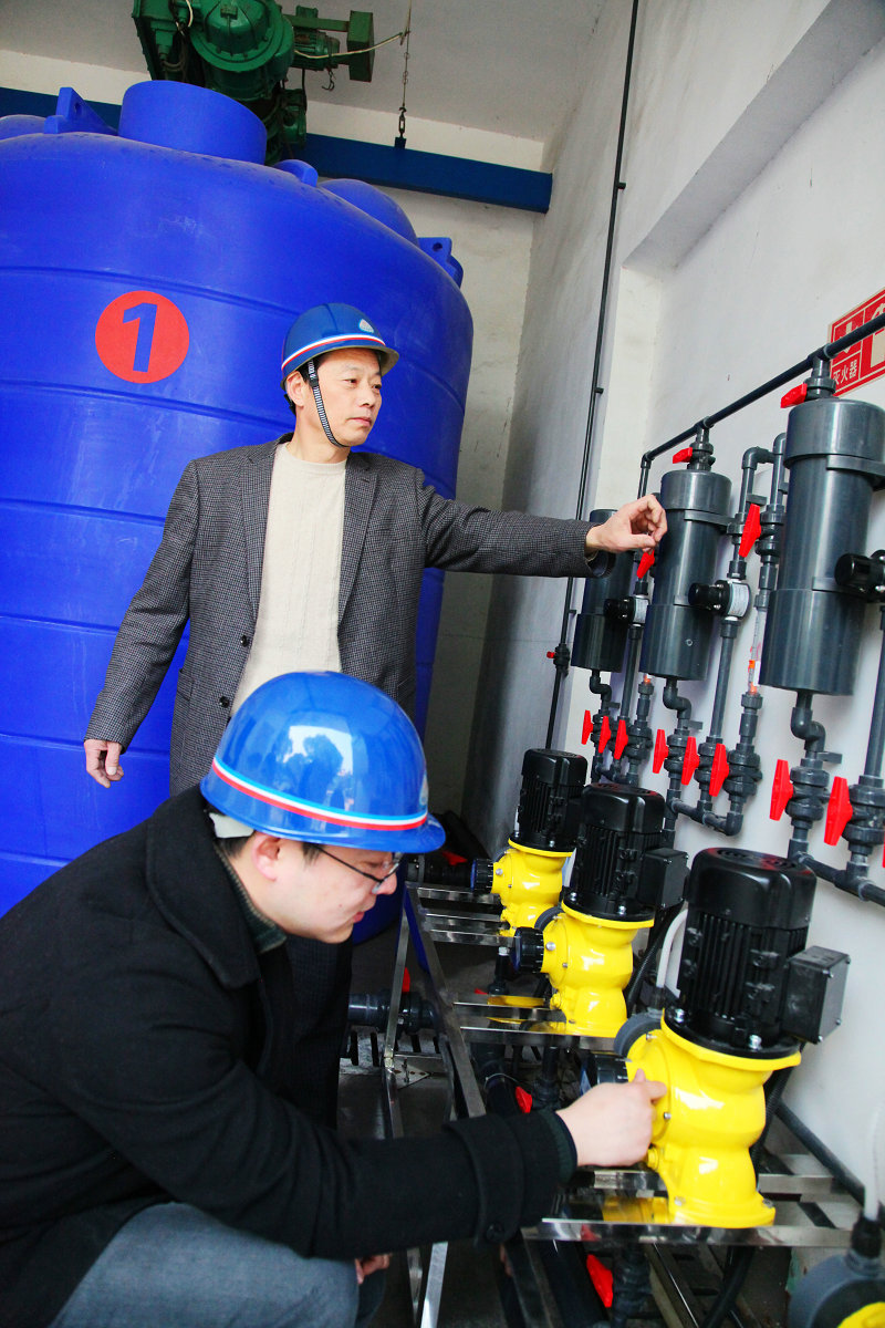 圖為工作人員正在調(diào)試加氯設(shè)備