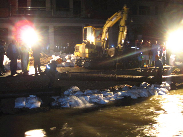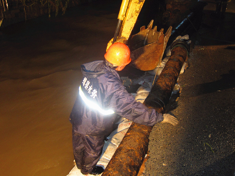 災(zāi)情就是命令!集團(tuán)接到縣防指命令后,立即啟動大口徑管道應(yīng)急搶修預(yù)案。根據(jù)受災(zāi)情況,集團(tuán)迅速派出由20多名人員組成的專業(yè)搶修隊(duì)伍,隨帶各種專業(yè)搶修工具,冒著大雨趕赴受災(zāi)點(diǎn),并于下午16時進(jìn)入現(xiàn)場開始搶修。經(jīng)過8個小時的持續(xù)作戰(zhàn),搶修隊(duì)克服重重困難,終于搶通供水管道。然而,凌晨3點(diǎn)多,敖紅了雙眼的搶修人員卻再次接到任務(wù),立即趕赴王壇鎮(zhèn)幫助王壇鎮(zhèn)水廠解決因停電造成管網(wǎng)無法輸水的問題,于凌晨5點(diǎn)恢復(fù)供水。