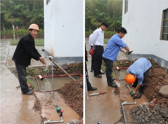 為盡快幫助村民解決用水問題,安裝小組冒雨前往。在安裝現場,我們看到有人在使用套絲機,有人在接水管,大伙忙的不亦樂乎。經過2個小時的奮戰(zhàn),順利為其接通水源,安好水表,并裝好了水龍頭。當現場看到水龍頭流出水的那瞬間,大家的心情都非常激動,費某的臉上更露出了久違的笑容,欣喜的用手接起了新家的“第一股清泉”。