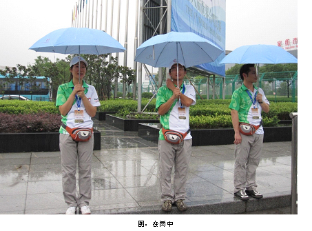 “傘,很多觀眾都沒帶,外面雨好大呀!”林隊(duì)長焦急地喊道:“同志們,考驗(yàn)我們的時(shí)刻到了!”這時(shí)隊(duì)員們二話沒說,很快統(tǒng)一著雨披,手拿著傘,奔向雨中,給如常的觀眾撐傘。隊(duì)員們不厭其煩的在大雨中往返于檢票大門和場館安檢口之間,不知跑了多少個(gè)來回,直到把一個(gè)個(gè)觀眾安全地送進(jìn)場館……我們痛并快樂著!